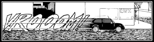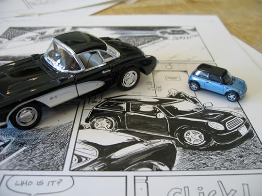 So, Rachel. Needed a car, so I gave her the most deadly vehicle on the road—the Mini. Now, I don't want to have to go downstairs to draw my parked car every time I need it in a panel of Rachel, so I went to a hobby store and found a tiny replica and I use that on my drawing table.