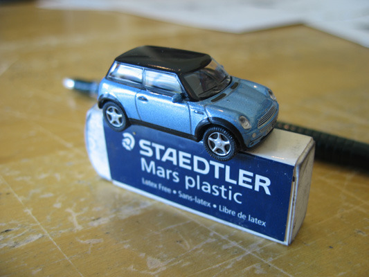 That's my real Mini on the eraser. I'm a lousy parker. The model is much smaller, of course.