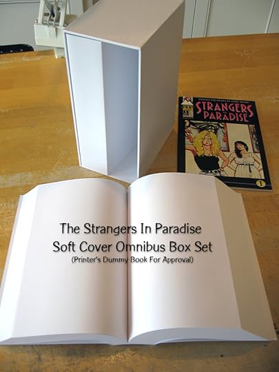 The good news is, the Strangers In Paradise Omnibus is coming along nicely. Tomorrow I should receive a hand-bound copy to proof dimensions, measurements, box fit, and anything else physical that could go wrong. Once that is approved, the printer will shift into high gear and begin cranking out books. The bad news is, once printed, the books will be loaded onto a slow boat from China, and we now know for sure it will not arrive in time for San Diego Comic Con week. Instead, it will arrive shortly after. It’s disappointing for me because I’ve always pictured that book making its debut at the SDCC. Since I don’t make these monster-sized books very often, I’m surprise to learn that half a year is not enough advance time to get something like this done. Who knew.