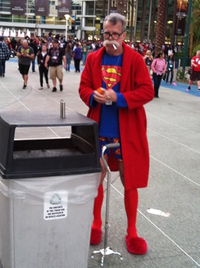 There was geriatric Superman, lighting a cigarette by the trash can. Dig the flask, daddio.