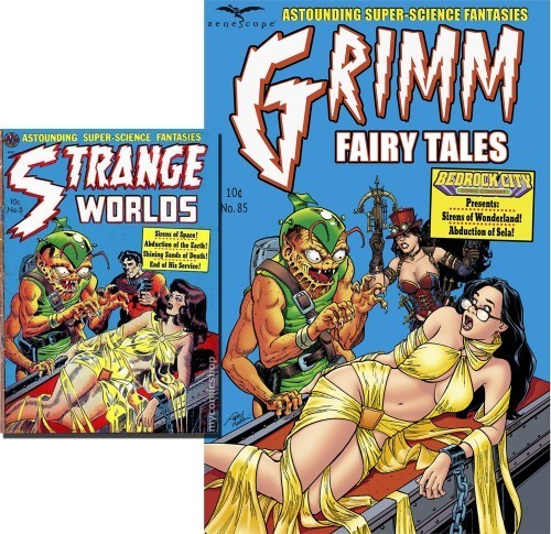 Grimm Fairy Tales #85, from Zenoscope will have a variant cover sponsored by my LCS, Bedrock City in Houston. They asked me to draw the cover, based on a well-known classic golden age comic Strange Tales #5. With color by the invulnerable Brian Miller, I think it came out very nice. You’ll have to track this one down, but you shouldn’t have any trouble if you go to the source, Bedrock City.