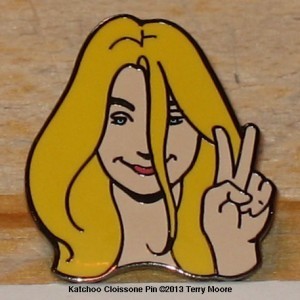 A number of years back, during the years I was making Strangers In Paradise, a reader sent me a picture of this cloissone pin from the Austin Hard Rock Cafe because, well, the girl looked awfully familiar. Recently he saw the pin at a collector’s market and bought it for me. SiP readers were incensed when I posted a pic of this very Katchoo looking pin on Twitter. As Darcy Parker Bruce put it, “Looks like someone’s in for some shit, she would NEVER wear something like that.”