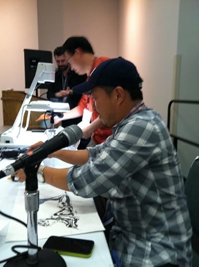 Saturday I joined Jim Lee, Frank Cho and Philip Tan for the CBLDF Art Jam. Those guys are incredibly talented and funny to boot, so this was fun for all. Below, left to right: Charles Brownstein (CBLDF), Frank Cho, Jim Lee. Check out the Catwoman Jim is drawing.