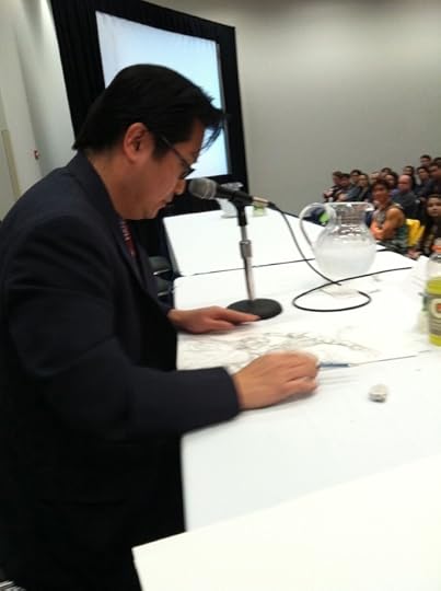 The room was packed to watch Jim, Frank and Philip make their magic. Here they watch the big screen monitor showing Frank draw while they giggle at all the politically incorrect things he said. Very funny guy but not recommended for uptight people.