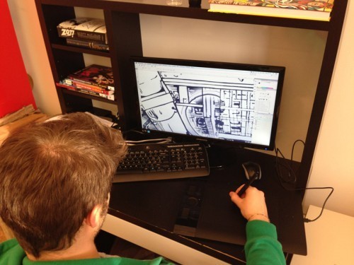 Act Three, enter the hero: Recently my Italian publisher BAO took matters into their own hands and carefully remade the cover themselves using the same process. They sent me this pic of their in-house graphics wizard at work on the art, extending the artwork to fill the new ratio.
