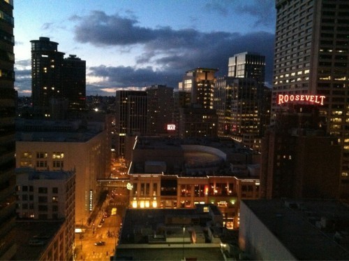 If you were brave enough to ride that elevator you could get to our room overlooking downtown Seattle. This was the view from our window. At night that Roosevelt sign glowed like the Bat Signal. Goodnight Seattle!