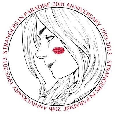 Here is the first look at the 20th Anniversary Strangers In Paradise print we will have at the cons this year. Printing will be limited to a few hundred, signed and numbered. I just finished this layout on Photoshop and showing it to you immediately, so it’s not even printed yet. The debut date will be at Emerald City Comic con in Seattle, so it won’t be available for worldwide online orders until that weekend.