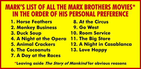 I posted it some time ago and some people still want to argue that Duck Soup is a better movie than the two I listed above it. They want to argue this even though it's not a list of what I (or anyone) would say are the best Marx Brothers movies in order of their merits. This a list of my personal preferences and telling me I'm wrong is like saying I'm wrong that I like McDonald's more than Burger King.