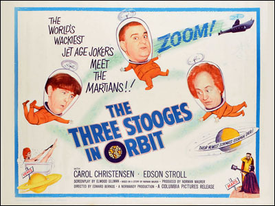 Here's another movie for you. It's The Three Stooges in Orbit, which is pretty much where they belonged. It was produced and partially written by an old pal of mine, the late Norman Maurer. He was the Stooges' manager and Moe's son-in-law and a very fine comic book artist. I think that's mostly his artwork in the opening titles. The narrator, by the way, was Don Lamond, who was the host of the show on Channel 11 here in Los Angeles that showed Three Stooges shorts when I was growing up. He was also Larry Fine's son-in-law. The Stooges believed in keeping things in the family.