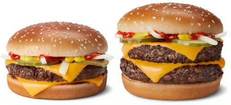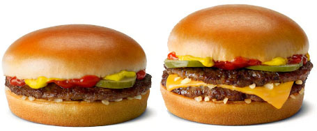 I should also mention that I prefer my McDonald's burgers with no pickles and no cheese but that omitting these elements does not alter any prices. No matter what the size of the burger, they charge me forty cents if I ask for an extra slice of cheese but don't deduct a cent from my order if I have them leave the cheese off a burger that comes with cheese. Now then…