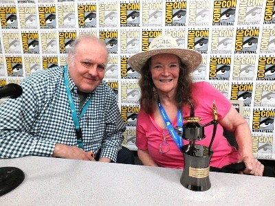 First, a photo from yesterday: That's me with the wonderful Jo Duffy, right after she received the first of two awards she's taking home from this convention. That's the Inkpot Award which Comic-Con bestows on people for their contributions to the comic arts. Later this evening, Jo received one of two Bill Finger Awards for Excellence in Comic Book Writing. It is usually my honor to present these but I was having some foot problems so I called upon my pal Charlie Kochman, who's on the committee that chooses the recipients, to do the honors. Here's the photo from yesterday…