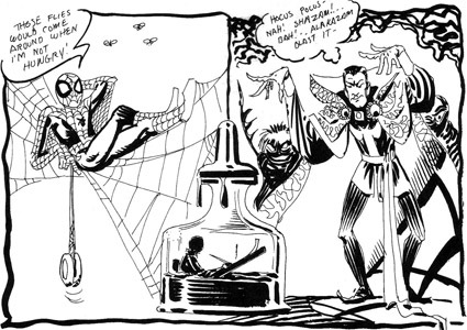 Before Jack started drawing that first story, he drew a presentation piece showing what the character would look like. Stan had okayed it.The story then was about a young orphan kid (roughly early teens) who lived with his aunt and uncle and who gained the powers to turn into the mighty, adult super-hero Spiderman (sans hyphen) at will thanks to a magic ring from a mysterious stranger. It was much the same way young orphan kid Billy Batson could turn when needed into the mighty, adult super-hero Captain Marvel or the way young orphan kid Tommy Troy could turn when needed into the mighty, adult super-hero The Fly. Jack wasn't supposed to be drawing a super-powered teenager. That wasn't the concept then…and a young kid turning into an only-slightly-older teenage super-hero is kind of a weird premise for a comic.