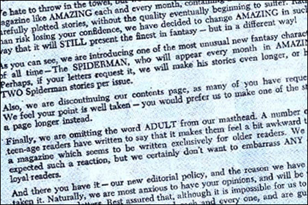 And the third thing that the Rolling Stone article said that brings up another theory is the story that Stan and Steve did that first Spider-Man story in Amazing Fantasy #15 knowing it was the final issue so they got experimental with it. My theory — and it's not just mine; others came up with this — is that they didn't find out it was the final issue until well after it had gone to press.