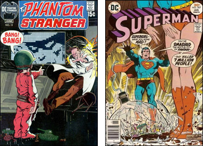 Neal Adams' covers appear to have been done both ways. Sometimes he was given a story and asked to illustrate the story, or he was given a page asking for a specific scene. On other occasions he was told, "just draw Batman in an interesting/dramatic pose." Or so it seems. My favorite Adams cover, or one of them, is from Phantom Stranger. It depicts a boy pretending to shoot a scientist in a lab, who reacts as if actually shot by a real bullet. In another, from Superman, we see a closeup of Supergirl's boots, the bottle city of Kandor smashing to the ground, and Superman yelling, "Supergirl, What have you done?"