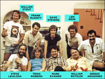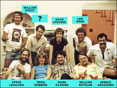 Recently, I was talking with the fine illustrator Ken Steacy and he mentioned a photo that he took at a gathering in my living room a long, long time ago. He was counting on my fabled excellent memory to recall the name of one individual in the photo. I absolutely remembered the also-fine illustrators William Stout, Dave Stevens, Steve Leialoha and Sergio Aragonés. I of course remembered the fine writers Len Wein and William Rotsler and the fine could-do-everything Trina Robbins and I could even identify the fine me. I have added labels accordingly.
