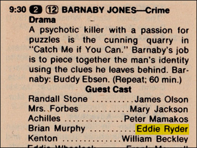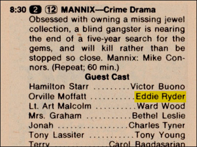Recently, some folks on Facebook have taken to scanning and posting pages from old issues of TV Guide. I noticed this morning a page from Sunday Evening, April 28, 1974. As you can see below, the CBS affiliate in whatever city this was from was rerunning an episode of Mannix and there's Eddie Ryder's name in the Guest Cast…