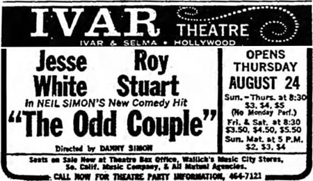In the late sixties, my parents took me there to see a production of Neil Simon's The Odd Couple. Jesse White starred as Oscar, Roy Stuart played Felix and it was directed by Neil's brother Danny Simon, who was in some ways the inspiration for Felix. I've written about it a few times here (here, for instance) and guessed then it was in 1967. I also reproduced this ad…
