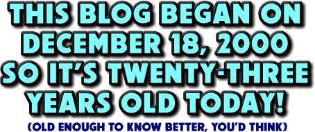 That subject line is the whole point of this post. I started this blog on December 18, 2000 with the idea of "Well, let's see how long I feel like doing this." You could have won a lot of money then by betting me that I'd still feel like doing it after ten years, let alone 'til now and beyond. It's work that pays almost nothing, true…but 95% of it is writing and I became a writer because I enjoy writing. I have decreasing patience with people who complain about putting in long hours in their chosen profession. I keep using the analogy of a plumber who bitches about having to fix toilets.