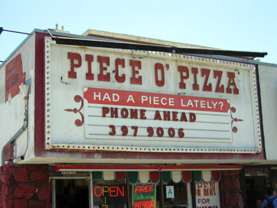 Guess I'm on a kick of recalling near-defunct restaurant chains. I was thinking today about Piece O' Pizza, a string of eateries that once decorated the Southern California landscape…an amazing reach considering the awfulness of their signature product. Do you like pizza where the crust tastes like matzo, the toppings have the thickness of carbon paper and you can't decide whether to eat the pizza or the box it came in?
