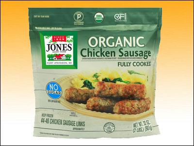 It's Jones brand Chicken Sausage and if you try them, read the instructions. They come frozen and they're delicious, especially once you learn to heat them properly, which will probably involve turning the Power Settings down on your microwave oven. They're real easy to overcook and you'll find that after you heat them, they should be consumed immediately. If you leave them around for a few minutes, the taste becomes increasingly less special.