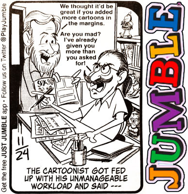 It's not a comic strip…but then neither is the daily Dennis the Menace, which is a panel Monday through Saturdays. Also, the puzzle panel Jumble competes for space with comic panels and is often featured with them on the funnies pages in newspapers. Jumble, which challenges you to unscramble words to arrive at the punch line of a cartoon, has been running in papers since 1954…only two years less than I've been running.