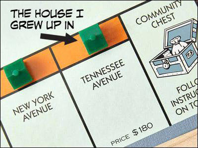 I picked up on the game right away and became so good at it that I won almost every time. Yes, I was very smart at that age…though not smart enough to realize that Grandpa, Grandma and my mother were often letting me win. Still, I might have won anyway because of my strategy. I always managed to acquire the three properties in the orange group — St. James Place, New York Avenue and Tennessee Avenue. I wanted it for two reasons, one being that it included Tennessee Avenue, the street upon which I lived.