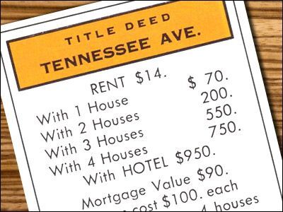 But as I found out years later when several different people wrote articles and books about How to Win at Monopoly®, buying up the orange group of properties is a pretty wise strategy. One reason of several: You can pretty much count on everyone going to jail one or more times during a game. One way you get out of jail is to roll doubles…and if you roll two threes, you then land on St. James Place (which is orange) and if you roll two fours, you land on Tennessee Avenue (also orange). And if I own the orange group and I've built hotels on it, you owe me $950.