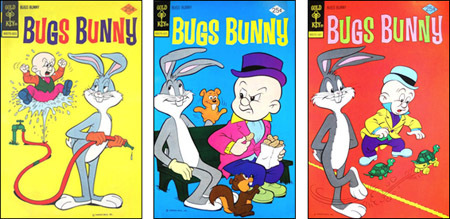 The person in charge of coloring the line art colors back east would take all the black-and-white versions of covers that would be on-sale at the same time and put them on a big easel or pin them to a wall. The idea was to see all of them at the same time. Then he (or she) would designate: "This issue of Bugs Bunny will have a yellow background and a blue logo while this issue of Pink Panther will have a green background and a white logo and this issue of Woody Woodpecker will have a blue background and a pink logo…"