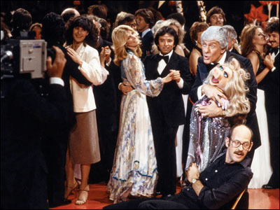 This is a still from the set of a Muppets TV special and I'm pretty sure it's the 1979 The Muppets Go Hollywood, which celebrated/promoted the release of The Muppet Movie. It's interesting because you can see the proximity of the Muppeteer (Frank Oz) and the human in the shot (Dick Van Dyke). One of the many innovations that Jim Henson either invented or perfected was having his characters perform right alongside people instead of having the puppet in some kind of stage separated from any non-puppets in the scene.