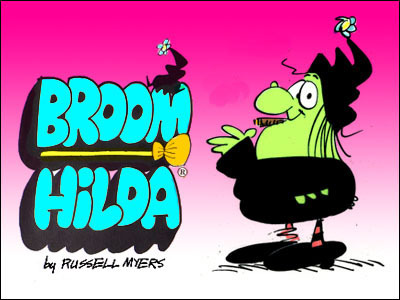 Back in this post, we noted that my pal Russell Myers has been drawing his newspaper strip Broom-Hilda with no assistance since it debuted back in April of 1970. That's over 19,000 daily and Sunday strips and he ain't about to stop. As you probably would assume, newspaper strip artists work way ahead of schedule and Russell is way, way ahead. If he quit tomorrow, which he has no intention of doing, he already has enough Broom-Hilda strips completed to take him over the 20,000 mark.