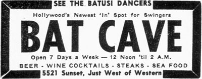 My thanks to quite a few folks who sent in info and pics. I got one note from a friend of mine who used to write for the Filmation cartoon studio in Reseda…which is where the 1968 and 1977 Batman animated shows were produced. He wrote that he vaguely recalled that on his way to work there, he passed a bar called The Batcave on the south side of Sherman Way near the intersection of Owensmouth. Maybe there was another Bat Cave there or maybe he was remembering this place on Vanowen between Tujunga and Vineland…