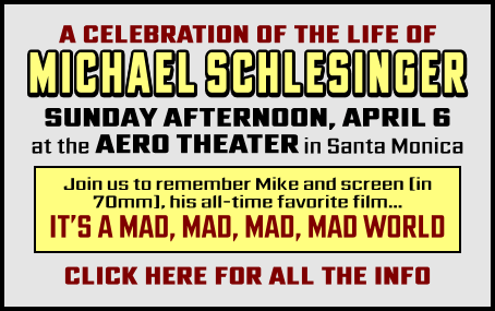 Once again, I remind you that the many friends of the late Mike Schlesinger — and I am on that long list of friends — will be gathering together in Santa Monica the afternoon of April 6. There will be stories about his life, clips of films in which he had some involvement, speeches by a fraction of those friends (all we have time for) and then those of you who want to stay around will watch his favorite movie, It's a Mad, Mad, Mad, Mad World.