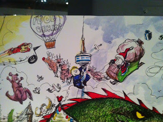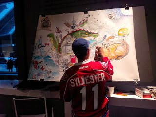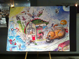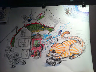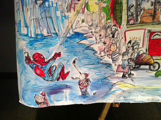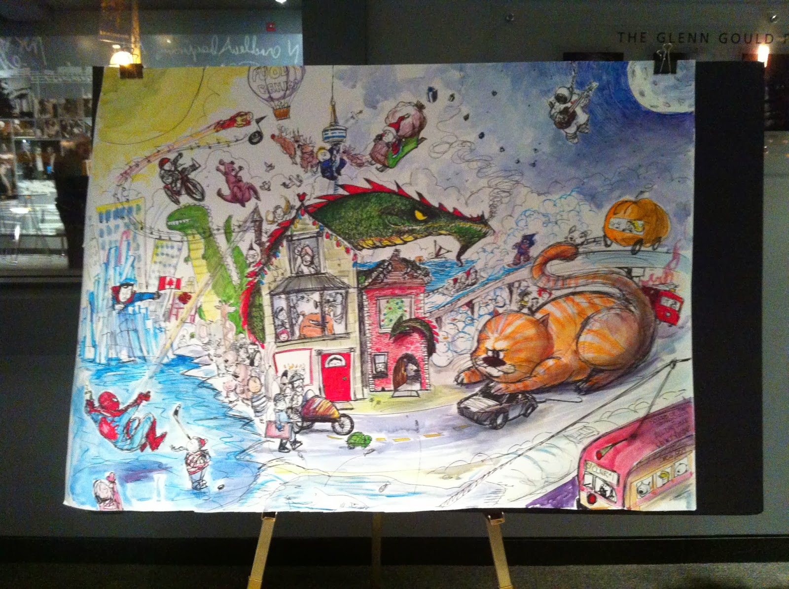 I did a "live full-day doodle" this year, incorporating suggestions from everyone who stopped by. That's why Spiderman has a coffee, there's a huge cat crushing a car... chaos. And a blast. I'm posting pics in a sort of WIP format. The pics with me in them are thanks to CBC / Tanja Tiziana.