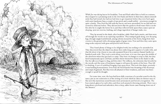 This is Tom during his prolonged absence from ordinary life. I kind of see him as (a) confused by the words on the facing page - he plays hooky a lot (b) perplexed by the mystery sound in the text and (c) beginning to feel the metaphorical deepness of life, which Twain represents as the Mississippi River.