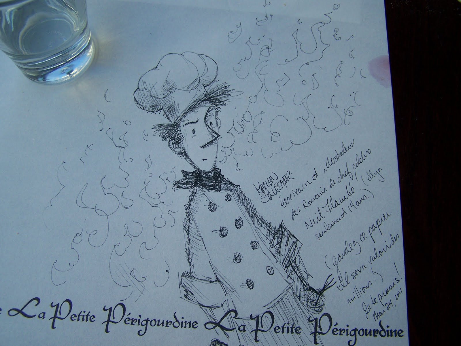 Boy has it been a long time since I posted. OOPS. I've just wrapped up an amazing week in Quebec touring as part of the TD Bookweek! Something like 18 school visits over 5 days. I'll be at Pages in St. Leonard tomorrow. I hope to have some pics up soon. In the meantime, here are some pics from my recent research trip to Paris. I drew little Neil Flambe pics on all the placemats... did the staff throw them out? burn them? keep them? Dunno....