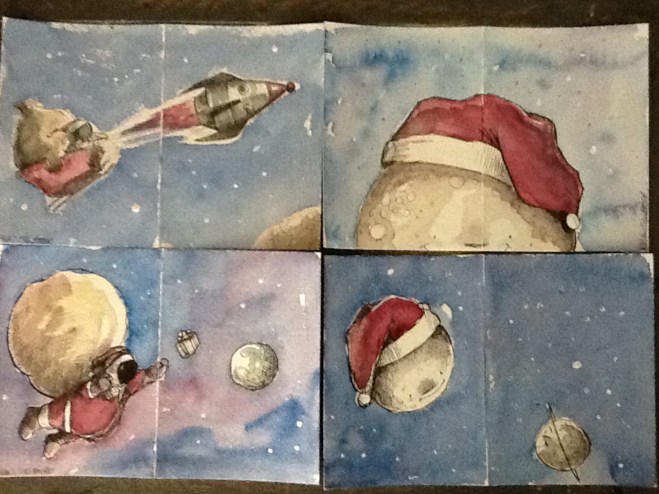 A space-themed holiday card, hand drawn and signed (by me)!