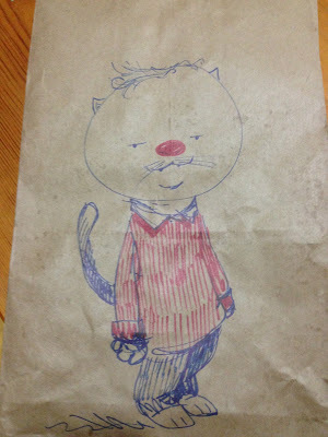 So here's a cat I doodled on the bag that our dinner arrived in (delicious Indian food from a restaurant named Banjara)!