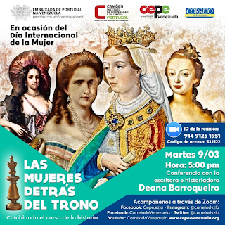 La Embajada de Portugal en Caracas conmemora el Día Internacional de la mujer con una conferencia histórica “Las mujeres detrás del trono” , a cargo de la escritora Deana Barroqueiro El 8 de marzo se celebra el Día Internacional de la Mujer, un día para luchar por la igualdad, la participación y el empoderamiento de la mujer en todos los ámbitos de la sociedad. Esta es una oportunidad para resaltar los progresos realizados hacia la consecución de la igualdad de género, la consolidación de las mujeres logrando reflexionar críticamente sobre estos logros y trabajando para obtener más dinamismo global.