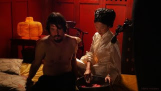 3. A personagem da amante chinesa, assim como o nome Meng e os seus amores, inventei-os, a partir da menção feita por Pinto aos filhos do português Vasco Calvo - «dois meninos e duas moças” -, no cap. 116 da sua Peregrinação. Ora a cena que se vê no filme de «Meng» com uma bacia de água perfumada de flores (na foto), a lavar as cicatrizes que Pinto tem nas costas, das chicotadas na prisão, é um dos episódios do meu romance que considero melhor conseguidos. A diferença é que João Botelho coloca a cena em Pequim e não na aldeia onde vão viver os portugueses junto à muralha da China, como condenados a trabalhos forçados)