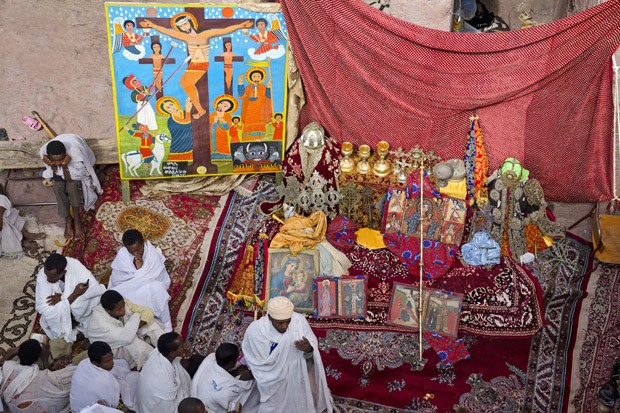 Ritual da exposição dos tesouros. Cálices de ouro, cruzes de prata e coroas de reis (Foto: © Haroldo Castro/Época)14º DIA - LALIBELAApós o pequeno almoço, visita de Asheton Maryam, um impressionante mosteiro onde se podem observar cruzes e manuscritos de valor inestimável. Atrás do mosteiro fica o Monte Abuna Yoseph e ao seus pés uma vista incrível de Lalibela. De tarde, após o almoço, visita do mercado local, especialmente colorido pela celebração da Páscoa Etíope. À noite, possibilidade de assistir à cerimonia da vigília Pascal, com as igrejas iluminadas com velas, um marco único em Lalibela, tendo como fundo da cerimonia, a igreja de São Jorge, uma das mais conhecidas pela sua forma de cruz. Regresso ao caravançarai Tukul Village para jantar e dormir.