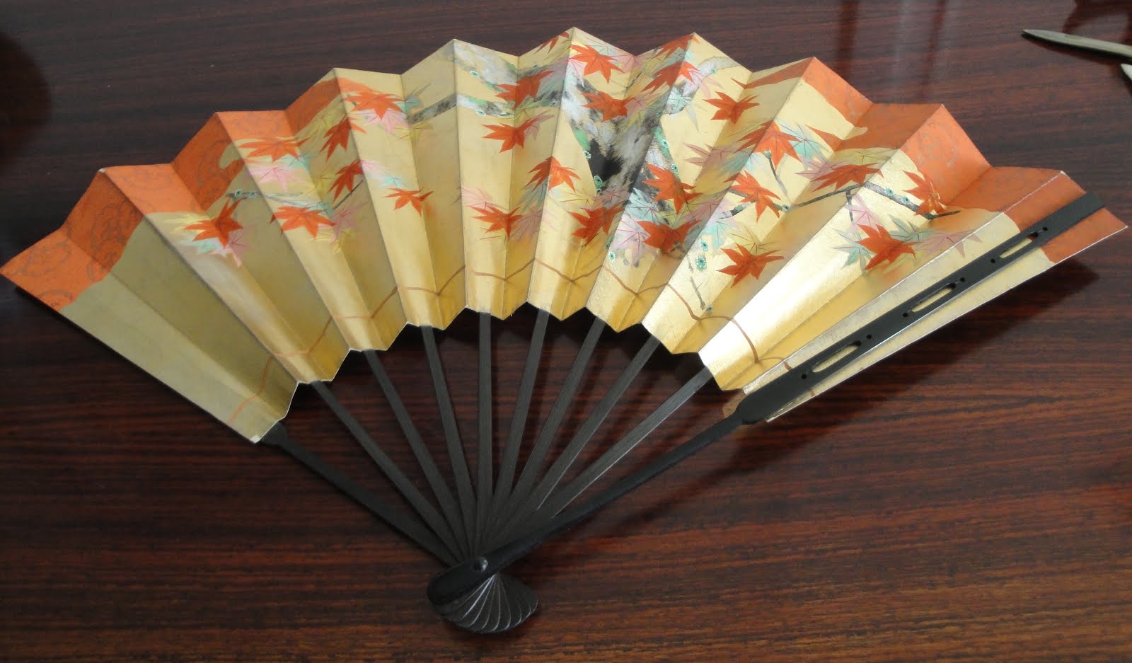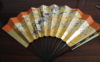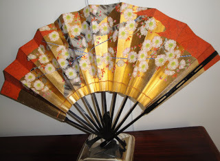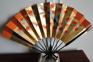 Um leque antigo, pintado à mão por um grande artista, para o teatro Noh. Um dos lados representa a Primavera, com ramos cobertos de flores; no verso está representado o Outono, com as folhas vermelhas dos áceres a cairem das árvores. Lindíssimo!