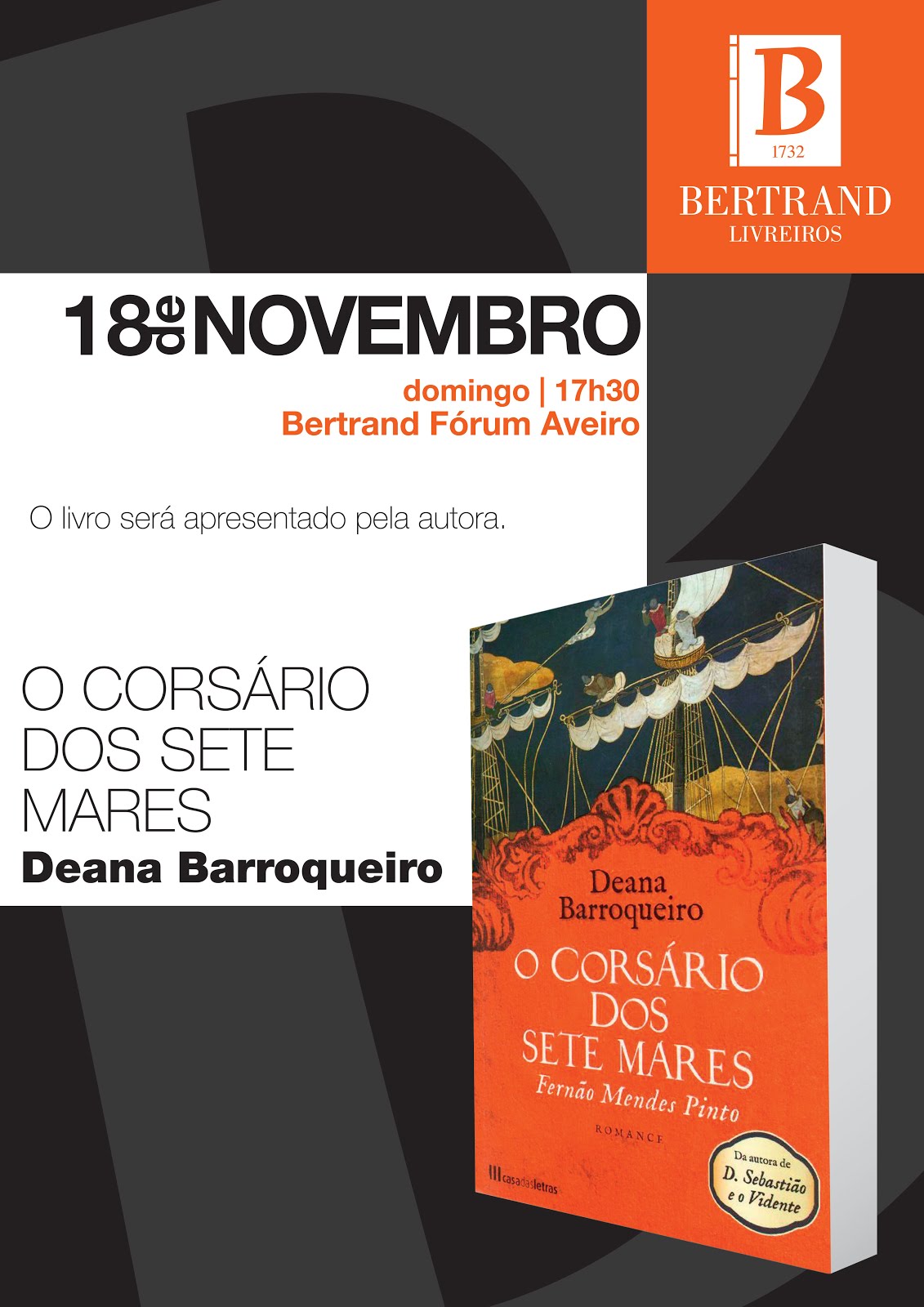 Atenção, caros Amigos de Aveiro, lembrem-se do nosso encontro na Bertrand do Fórum, Domingo dia 17, às 17.30. O nosso amigo comum Celso dos Santos, presidirá àa Tertúlia e faremos ambos a apresentação de O(s) Corsário(s) dos Sete Mares . Plural, porque, quando falamos de Fernão Mendes Pinto, ele é o pretexto para se evocar muitos outros e falarmos deles como pioneiros da globalização. Estaremos à vossa espera com uma pequena surpresa! Aqui têm o cartaz da Livraria, que até é bem giro, embora não sobressaia no fundo negro do meu blogue!