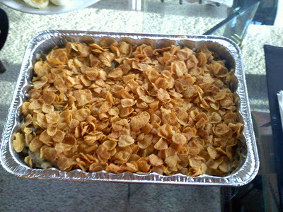 Put in a greased casserole. Sprinkle with cheese, then corn flakes. Dot with butter. Bake at 400 for 20 minutes.