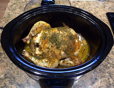 I have a large crockpot with a rack insert, but you can probably adapt the recipe to slow roast in your oven. Or, roast it in your crockpot on a bed of root vegetables to keep the chicken from being immersed in its own juices.(Which might not be that bad, either.) Anyway, the recipe is modified from the cookbook that came with the crockpot.