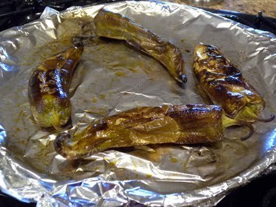 Roast poblano peppers, peel and cut into 1 inch pieces. (I also discovered during my research that poblanos and Anaheims are the chiles used for those cans of green chiles, so feel free to avoid all this work and use those. I probably will next time!)