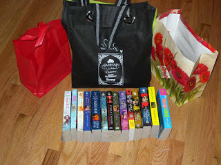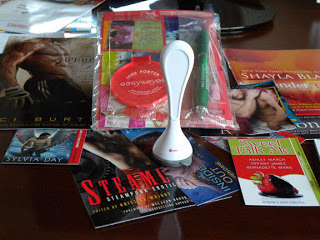 One thing there's a lot of at reading/writing conferences is swag, or all those free giveaways. RomCon was no different. Everything from business cards to bookmarks to notepads to pens to postcards to excerpt booklets. Plus the slightly more unusual: a tape measure, luggage tag, and a