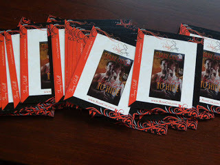 Now, unlike many of the bigger publishing houses, my publishers don't give me boxes of books to hand out. I did have about a dozen books I gave away to people who stopped by my table to chat. One of the ways I decided to select who'd get a book was to write a note on the back of a few of my trading cards. Let me say that there are still two people out there somewhere who could have had a free book had they flipped the card over!