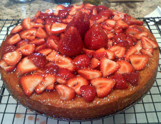 Dip whole strawberries in glaze and set aside. Add sliced strawberries to the glaze and mix until nicely coated, then put on top of the torte. Decorate with whole glazed strawberries. To serve, cut into wedges. A dollop of whipped cream is a nice addition, but not a must. Serves 8 to 10