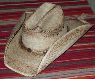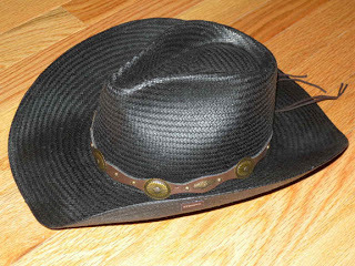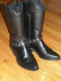 Either my new cowboy boots (assuming the store gets them in as promised--I don't consider them a "special" purchase, as I'd ordered them before I got my assigned part, and after all, I do live in Colorado now!) or bedroom slippers that look enough like moccasins to pass. Hair in pigtails under my cowboy hat. I have a necklace my daughter made that definitely has a Native American thing going.