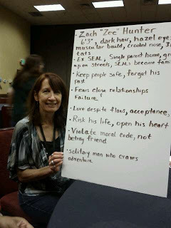 Each table (we were divided up by sub-genres) had to write all our points on a large white board, and then present our hero to the entire room. I volunteered to do the writing, and Robyn did our presentation. Of course, she managed to sneak in one of the points we were merely joking about – that our hero was impotent and he'd need the love of a very special woman to be whole again.